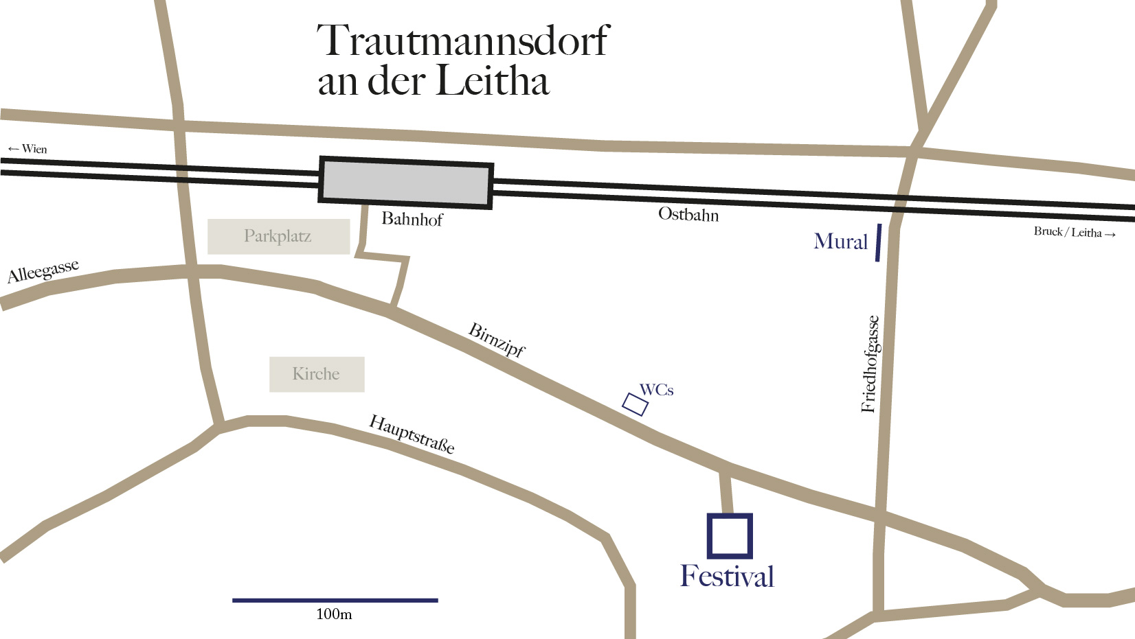Von Wien Hauptbahnhof ist man in nur 30min mit dem Zug (S60 Richtung Bruck/Leitha) in Trautmannsdorf/Leitha und vom Bahnhof sind es nur etwa 200m bis zum "Festivalgelände". Die Züge von Wien fahren stündlich um xx:50 (also z.B. um 8:50, 9:50, ...), am Freitag bis 20:00 sogar jede halbe Stunde (15:20, 15:50, 16:20, ...).